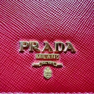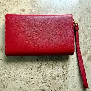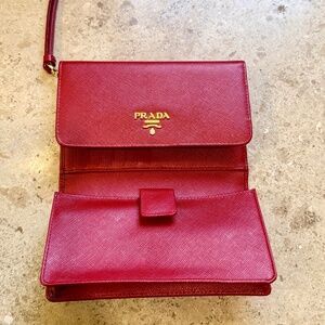 Authentic Prada wristlet wallet with a phone compartment in saffiano leather. Fiery Red color. Fits iPhone 16 pro. Seven ID/credit card slots and a separate larger slot for bills and receipts. Six inch removable wristlet. Size - 6 x 4 x 1 inch. Wristlet is 6 inches long. In excellent condition, having used less than 10 times total.