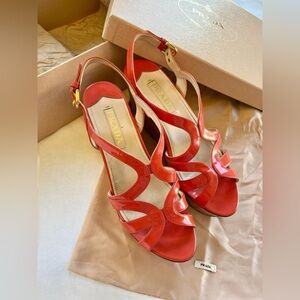 Prada Y2K Wedge Sandals • Coral Red Patent Leather • Box and Dustbag • size 7