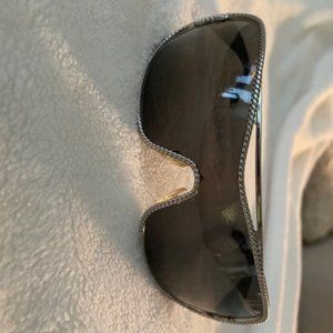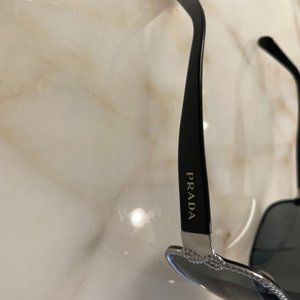 Black, with silver beaded trim, beaded bows on each side with Prada logo on arms. They are literally in brand new condition. I have had them for years and just unearthed them. They did not fit my nose after I had rhinoplasty and never wore them. There are not any scratches on the lenses. I wish they fit my face