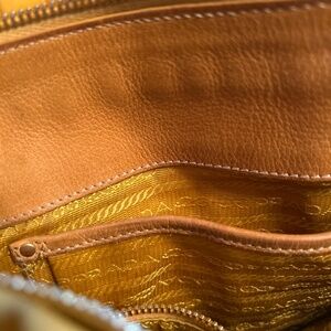 Yellow Prada with removable shoulder strap. Short braid handles. Bag is in excellent condition. Inside perfect. A little dirty on back. I guess from rubbing against dark clothes. Can be cleaned ….I chose not to …..all working zippers and attached key fob. 8 by 12.5. ….beautiful spring bag