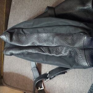 Prada black leather shoulder bag messenger style. Black grain leather. Gunmetal hardware. Inside pocket with zipper. Used but good condition. 31" Long. 14" wide.