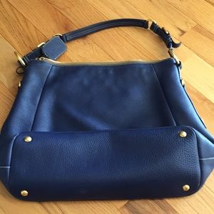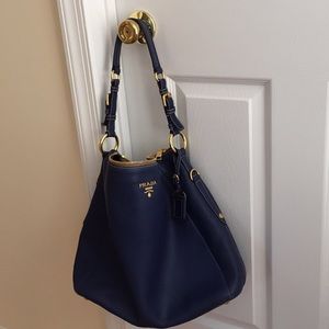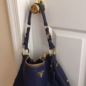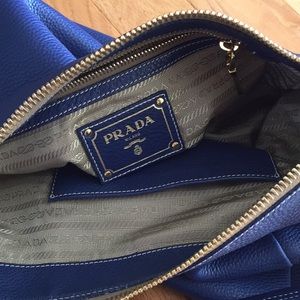 Prada authentic! Gorgeous royal blue purchased in Milan Italy. 14"tall by 14" wide. 5" deep. Hobo style. Beautiful shiny gold hardware pocket inside dust bag and shopping bag included. Terrific condition!