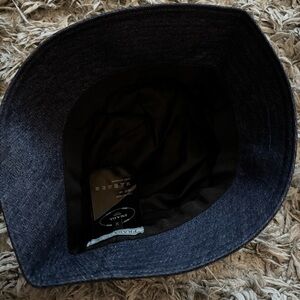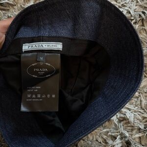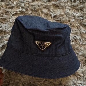 Authentic Prada bucket hat in dark navy blue denim with triangle logo in black and silver hardware on the front.