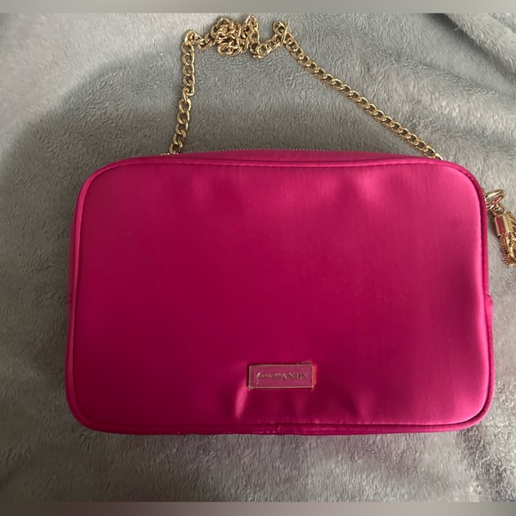 Vibrant pink crossbody bag with gold chain strap. Stylish and chic.