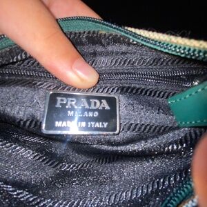 Logo: A green rectangular Prada logo tag on the front with white lettering.
