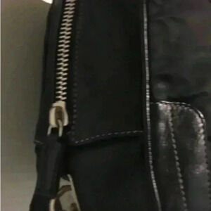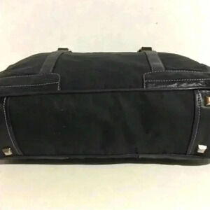 Authentic Prada black canvas/ leather satchel bag with silver tone hardware main compartment 1 zip pocket closure at interior wall zip closure at top leather strap & trim logo at front with 2 tassel protective metal foot base lock with key black satin fabric lining exterior have creasing corners have some tear The dimensions are based on approximately measurements before placing an order please check take a moment to view all photos using feature for a closer look