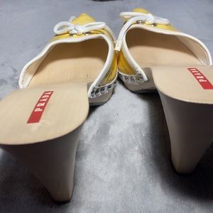Prada clogs in size 37 patent leather yellow with rope string on the front tied. I’ve had these stored and the patent leather was discolored. Offers welcome bottom of heels have been resoled with a better sole for grip. Woden heel very cute