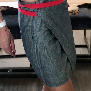 Super cute wrap skirt in a lightweight fabric. The red ribbon wraps around a few times to tie. There is a red leather Prada logo on the outside. I purchased this in Milan and forgot I had it. The skirt will fit a small or medium. For reference, I am 5'10, 25" waist and 34" hips.