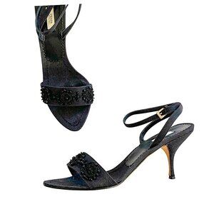 Prada denim ankle strap heeled sandal with black beading, size 38 EU