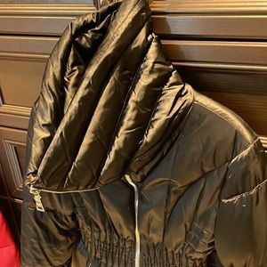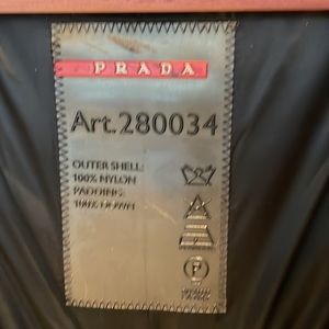 Authentic Prada puffer with high collar and cinched waist. Nylon and 100 % down. Black