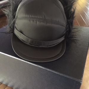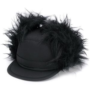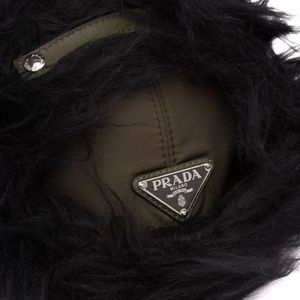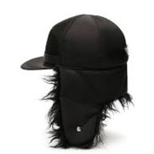 NWT Prada black faux-fur mohair flap cap features a straight peak, rear logo plaque and mohair ear flaps with a top snap fastening. Comes in black Prada box. Shown on Muiccia Prada's Fall 2019 runway. Size M. Comes in original black Prada hat box as shown in images. Flaps can hang down to cover ears or snap on top. Brim features a front black band. Retail $480.