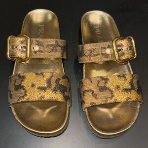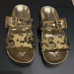 Authentic Prada gold lame’ fabric leopard buckle sandal size EU 37 1/2 , US 7 1/2 great condition never been worn! New without box