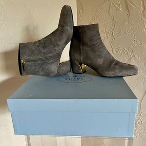 Prada ankle boots, grey suede, square toe, gold accent on heels, very good condition, wore only a few times, 38.8 runs 1/2 size small,