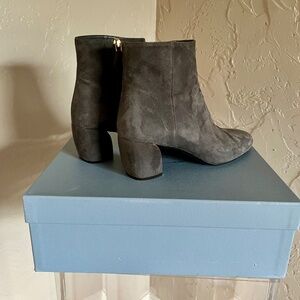 Prada, grey suede ankle boots, 2" heels, square toes, concealed zipper, sz 38.5,
