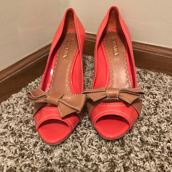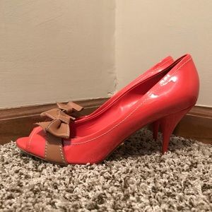Salmon colored patent leather with a tan leather bow. Excellent condition.