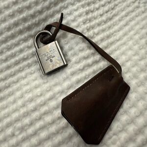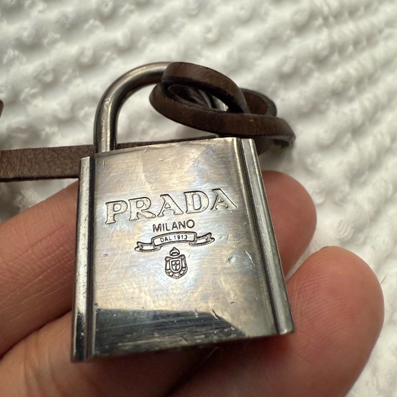 Elevate your style with this Prada key Featuring a sleek silver and brown design, Perfect for any elevate your bag accessories