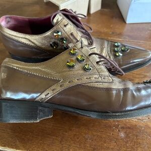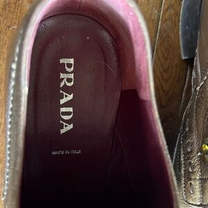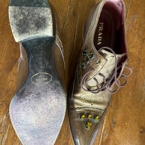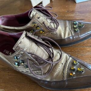 Cool Prada loafers with brown patent leather and bronze inset with punch detail. Adorned with crystals !! Worn twice … have a foot injury which prevents me from fitting in them now .. 😢
