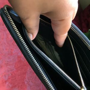 Soft pebbled leather. Normal wear. Torn lining in zipper coin section. Inner zipper pull hook chipped but have the zipper pull if you want to take to the cobbler to reattach.. This doesn’t not affect the zipper …zipper inner and outer works perfectly.