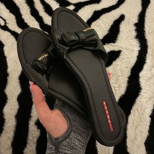 Prada leather black bow sandals / flip flop slide flats