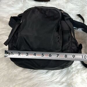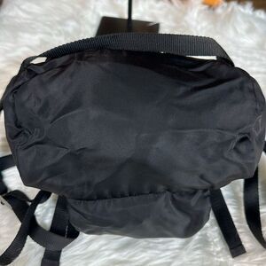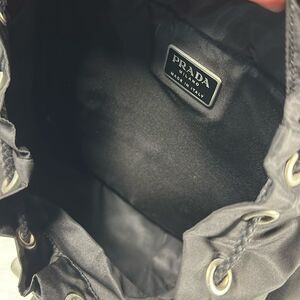 Black Prada mini backpack. had a broken clip and missing zipper pulls. Fixed those issues. Pulls and drawstring not original. Removed chest strap. Polished the metal. In fair condition.