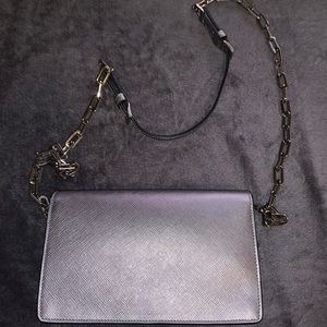 Prada leather bag with medal hardware chain and leather adjustable strap. Medal logo on front, leather lining with patch pockets & medal zipper inside. Includes Certified Card.