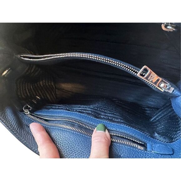 Prada navy blue pebble leather two way shoulder crossbody bag silver hardware