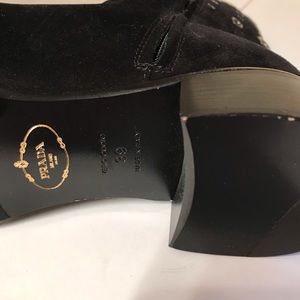 I’m cleaning my closets. Prada new without box knee high boots. They are gorgeous with silver grommets and suede wrapped toppings. Side zipper. Size 39.