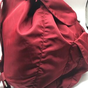Preloved red Prada nylon back. Features two front pockets, a zippered inside pocket, and adjustable cloth straps. Clean interior. Perfect everyday hands free bag. Perfect for travel as well with the extra security of both magnetic and buckle closures.