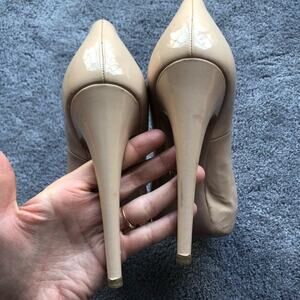 Tan color with a peep toe. Beautiful shoes. Prada logo is missing from the one shoe. Some scuff marks on side of shoe, on back of one heel. Photos show all damages.