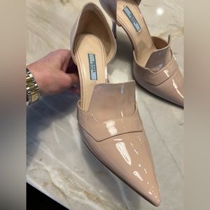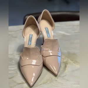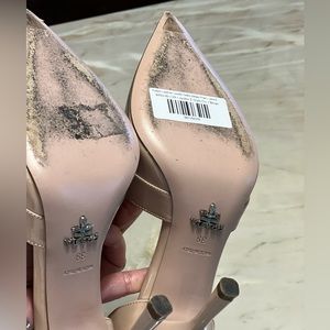 Excellent condition and were worn once or twice. One shoe has some discoloration but it’s not really noticeable unless looked closer. I am not sure why it happened on the shelve but I haven’t tried to remove it. Otherwise they are beautiful comfortable and almost new. Come with individual Prada shoe pouches.