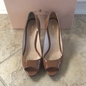 Prada Designer shoes in nude patent leather peep-toe pumps! Heel is about 4 inches. Like new! Only worn maybe 5 times. Made in Italy. Size 39. Prada box is included.