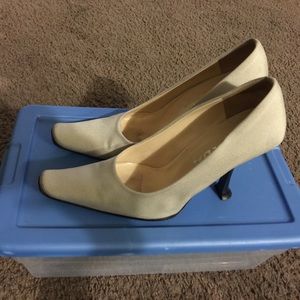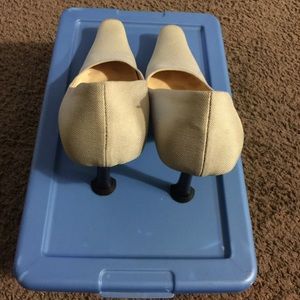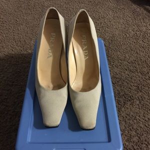 Prada beige canvas pumps with black bottom and black heel they have been worn a few times still in great condition one tiny blk mark on the inner side of left shoe.