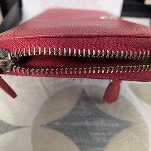 A Prada wallet crafted in saffiano leather with silver-tone and a fully lined interior. This Prada wallet features a zip around closure with 2 bill pockets, 2 slip pockets, a center zip pocket, 8 credit card slots and a back zip pocket. CLEAN interior. Slight wear on sides. Includes original box and authentic card. Purchased in 2017 from Prada store. Only carried it for a couple of months. The color is beautiful.