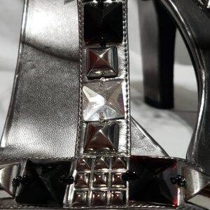 Silver and black prada slingback heeled sandals one heel has a wound and is shown in photos size 37.5 us size 7