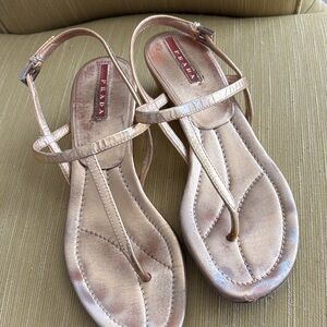 Prada, size 7, (37.5 EU) brown & gold shimmer, Cork Snake Print Leather Sandals. Gently preloved in great shape.