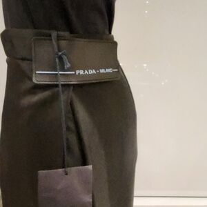 Prada skirt: black; sz 42 (Italian = size 6 in US); lightweight; velcrose closure (wrap around skirt); PRADA on a rubber disc.