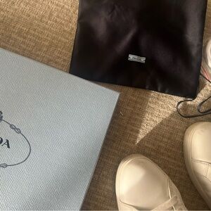 Red and white flat sole sneakers, comes with Prada box and bag, worn, see photos. I don’t have proper cleaning supplies for these so I didn’t do much to avoid damage.