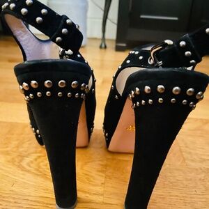 Prada suede studded platform heeled mules size 38.8. Gently Worn but wonderful condition. Heel height about 5 inches and platform 1ish inches.