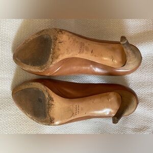 Gorgeous design with stacked heel. Small platform in front. Please see up close photos. There are scuffs that a good cobbler should be able to make all better!