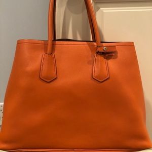 Prada unstructured tote in beautiful orange (brown inside except for orange pocket l). Handbag is very soft leather. Unstructured tote with a snap on each side to allow bag to expand. Handbag is in great condition with very little wear. Originally purchased from Prada boutique in Houston Saks 5th Avenue. Comes with box and dust cover.