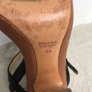 These shoes are not new , The black up or is in perfect condition the side leather platform has some scuffing on the toe and a little around the top of the heel's. They could possibly be reconditioned, I have reconditioned a little bit and it seems to take. The side of the platform is leather or leather likeThey have a 5 inch heel and 1" platform. The gold in the name Prada on one shoe has worn away