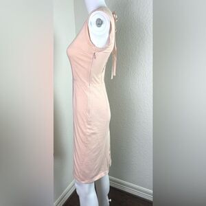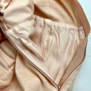 This stunning Prada dress features a vibrant peach hue and a chic scoop neckline, perfect for a night out or day. The sleeveless sheath design offers a sleek silhouette, with a side zip closure and a tie feature in the back. Dress is partially lined. Dress up or down to go from work to a night out.