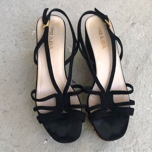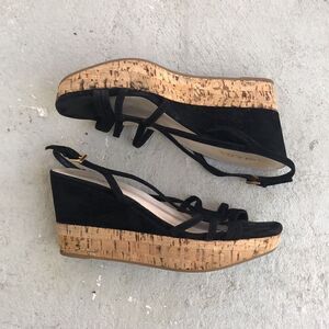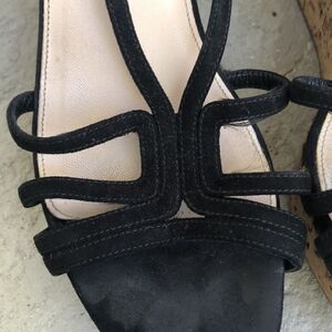 Cute, wedge cork shoe is suede, Check out the pictures. They are in good condition but not perfect. Heel height is 3 inches platform. Height is 1 inch.