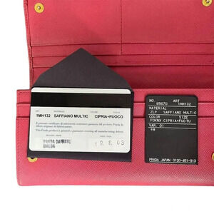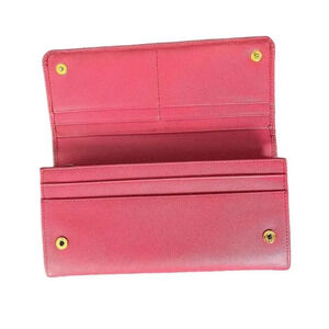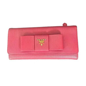 Keywords: Prada, wallet, women's accessories, pink wallet, Saffiano leather, bow accent, credit card slots, solid pattern, pre-owned.
