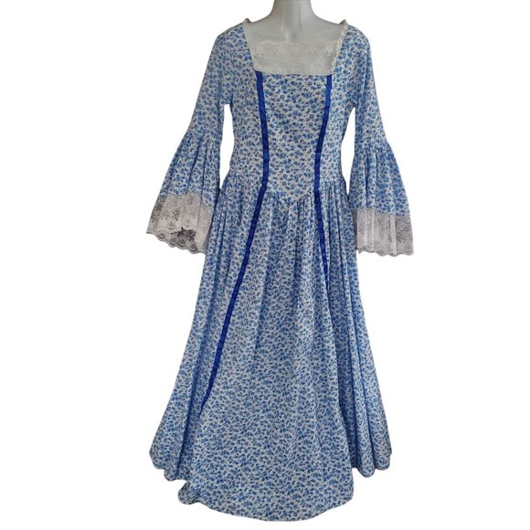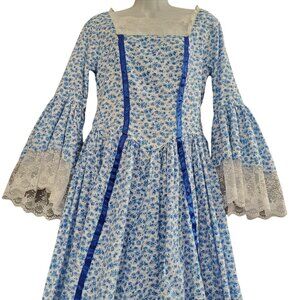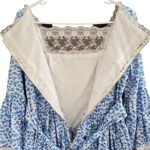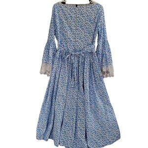 Prairie Cottage Core Maxi Dress Blue & White Floral Poet Sleeve Women's Med