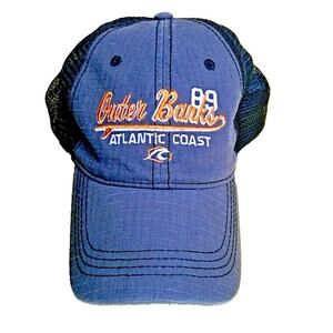 This is a Prairie Mountain brand Outer Banks Snapback Trucker Hat/Cap. It is Gray check cotton in the front, with black mesh and snapback. The face reads Outer Banks in Orange and White cursive with a surfboard device extending below from the tail of the "s". There is the number 89 in the top right. Below is ATLANTIC COAST spelled out and a wave inside a hexagon below that. The bill is curved. No damages or defects. Sold as-is, shipped bagged and boxed.