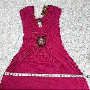 Prairie New York size medium dress, it has cap sleeves, v-neckline, MIDI length, solid rose pink color, ruched waist with front embellished gemstone accents, flowy A-Line, lightweight soft and stretchy fabric. Materials Shell 100% modal. Care hand wash cold line dry. MFSR:$300.00. Semi-precious stone are not identified on the label, they appear to be black onyx, citrine and type of quartzite. Condition is new with tags as shown in pictures. Please preview the measurements to ensure fit.