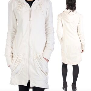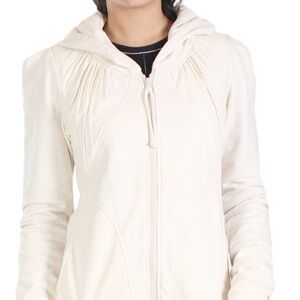 A fitted hoodie with seam work throughout the body, muslin gathering below hips, princess cut sleeves, side pockets and two large, and a two-way zipper.