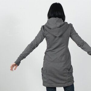 Hourglass shaped hooded sweatshirt with seaming that suggests layered garments. Fitted body with inverted pleat, puff shoulder and extra long sleeves.