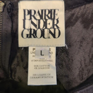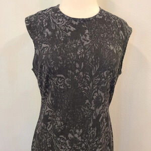 Prairie Underground Jacquard Sheath Dress. This sleeveless dress has a charcoal and black jacquard print. It is a midi length sheath style and has a hidden back zipper. It’s in excellent preowned condition.